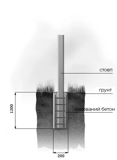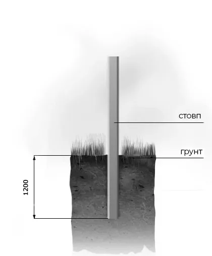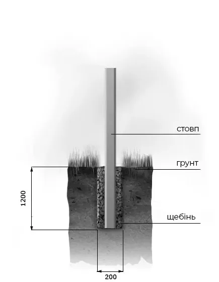 3.) Способи монтажу стовпів Залежно від типу ґрунту установка стовпа в ґрунт проводиться на глибину 1200 мм за допомогою забивання, бетонування дрібним щебенем фракції 5-20 мм. Для цього в заздалегідь пробурений шурф діаметром 200 мм вставляється стовп і пошарово трамбуються щебенем. Даний спосіб підходить для всіх типів ґрунтів, в тому числі для болотистих місцевостей, а також для ділянок з великим вітровим навантаженням.