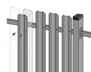 5.) Монтаж штахетини до поперечок Монтаж металевого паркану може бути виконана за допомогою кріплення штахетин або з одного боку паркану, або по обидва боки в шаховому порядку. При установці євроштакетника в шаховому порядку забезпечується вільне проходження повітря (продувність) і захист ділянки від сторонніх очей.